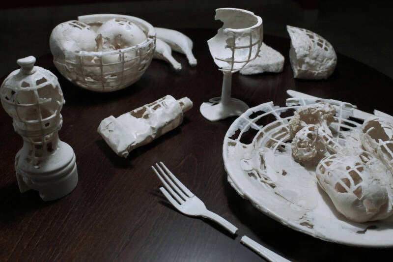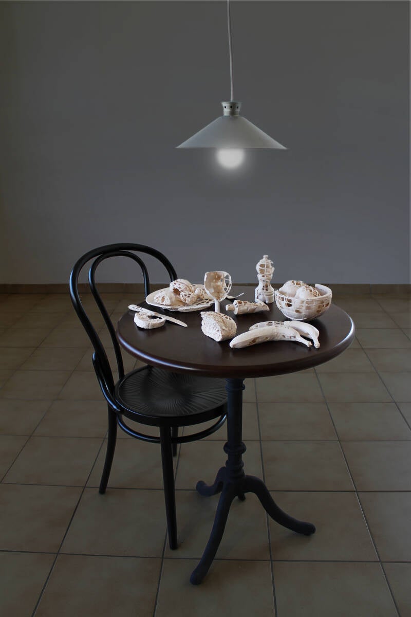 Ein Tisch, gedeckt für eine einzige Person, auf dem sorgfältig arrangierte Objekte aus Acrylharz liegen, erinnert an eine alltägliche Mahlzeitszene, bei der Besteck, Utensilien und Nahrung plötzlich versteinert zu sein scheinen.