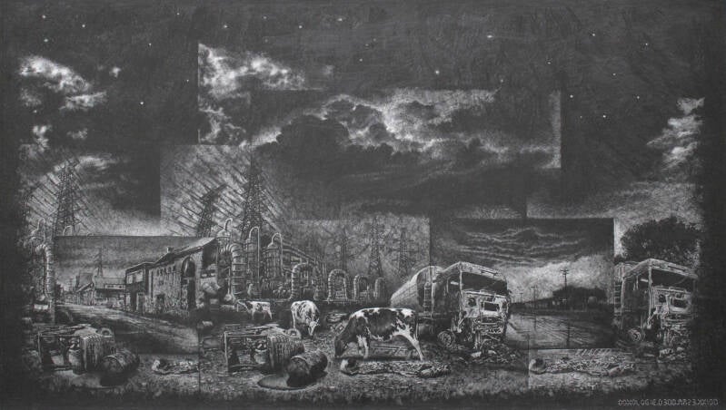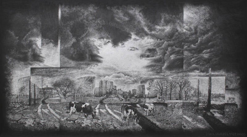 Im Zentrum dieser verwüsteten städtischen Landschaften stehen drei Kühe als stille Zeugen. Diese friedliche Dreifaltigkeit, die sich inmitten des Chaos bewegt, scheint die Welt mit einer zeitlosen Weisheit zu beobachten.