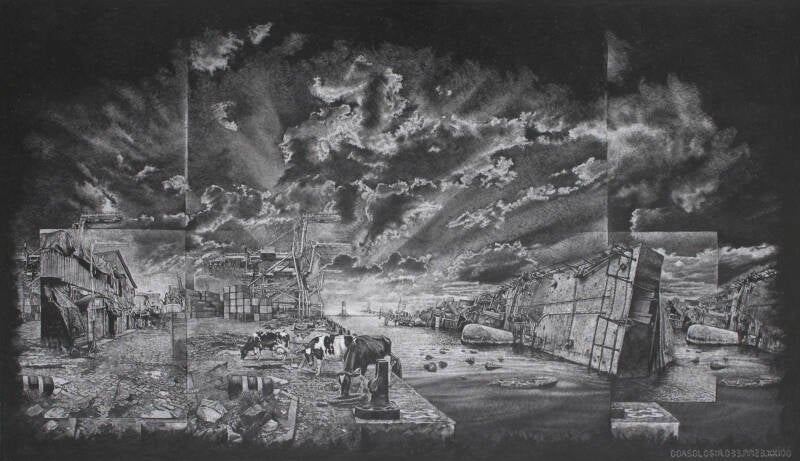 Diese Zeichnungen bestehen aus einer Mosaik von Bildern, die aus der Vielzahl der im Internet verfügbaren Aufnahmen ausgewählt wurden. Sorgfältig angeordnet, um eine kohärente Komposition zu schaffen, stellen sie uns vor eine Chimäre, in der die Erzählung offen bleibt und durch seine erzählerische Essenz zur weiteren Deutung einlädt.