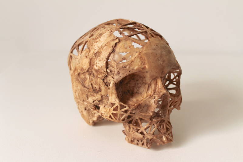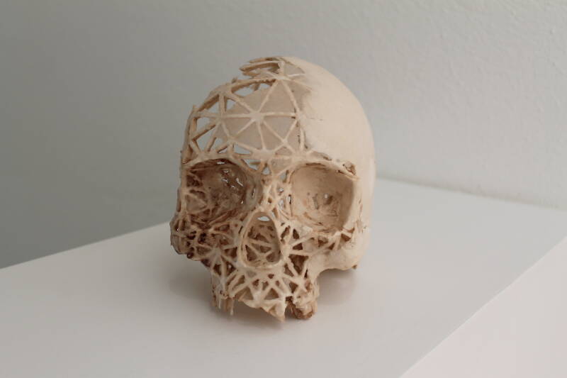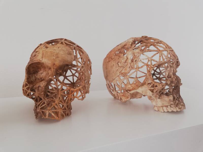 Das Aussehen der Schädel deutet auf eine „Dekonstruktion“ hin. Jedes Stück bewahrt die Spuren einer minutiösen Modellierung, eine Voransicht des in die Materie projizierten Denkens. Dieser Modellierungsprozess wird zu einer Reflexion darüber, wie das Denken Gestalt annimmt, wie das Abstrakte Form gewinnt und sich in der Ewigkeit verfestigt.